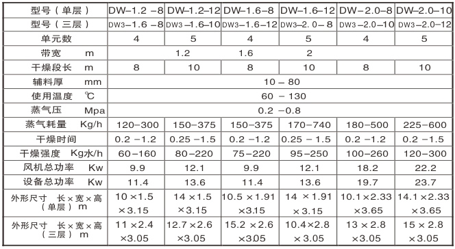网带式干燥机主要技术参数: